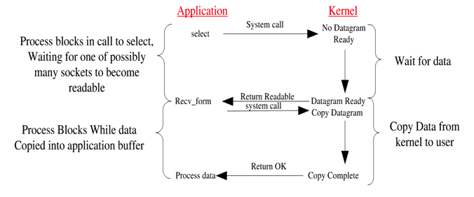 - 這個方法類似 blocking IO,但進行了兩個 system call (select 及 recv_from),但 select 可處理多個 sockets。