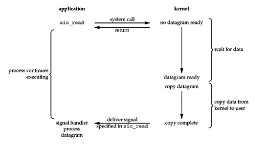 - 當 process 進行 read,就可以處理別的事情,當 kernel 收到非同步 read,就會馬上 return,直到將資料複製到 user space,完成後,才會發送 signal 給 process,通知已經完成了 read。