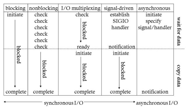 - synchronous 跟 asynchronous 的差異是 IO operation 會不會 blocking process,因此前面四種 model 都屬於 synchronous IO
