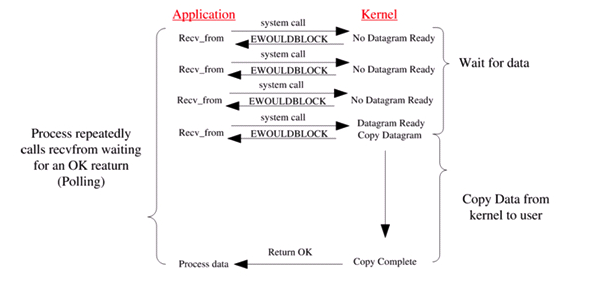 - 當 process 呼叫 recv_from 如果 kernel 還沒將資料準備好,他不會 block process,而是產生 error,直到 kernel 將資料準備好,就會複製到 user space,並完成該讀取的工作。