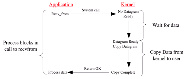 - 當 process 呼叫 recv_from,會進入 wait for data 階段,在這個階段的 process 會進入 blocking 狀態,直到 kernel 將資料複製到 user space,該 process 才會解除 blocking 狀態,重新運作。